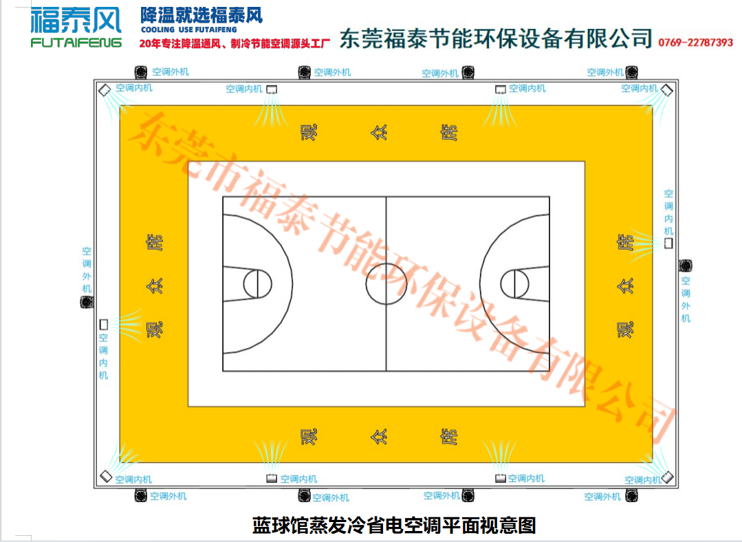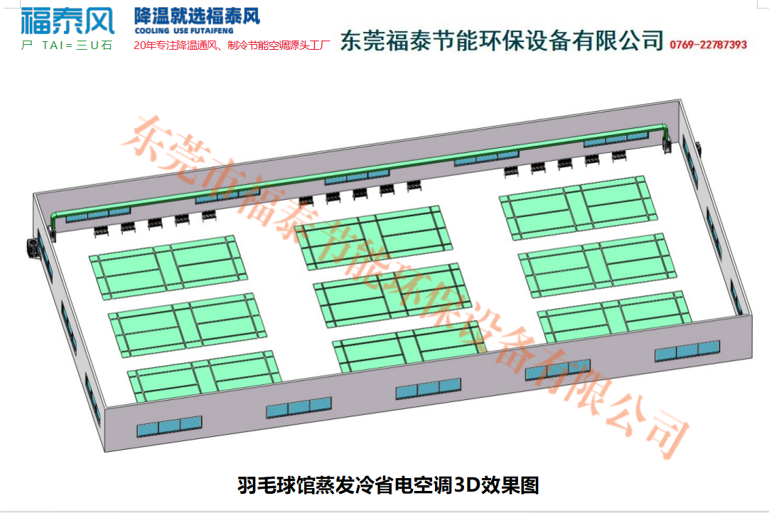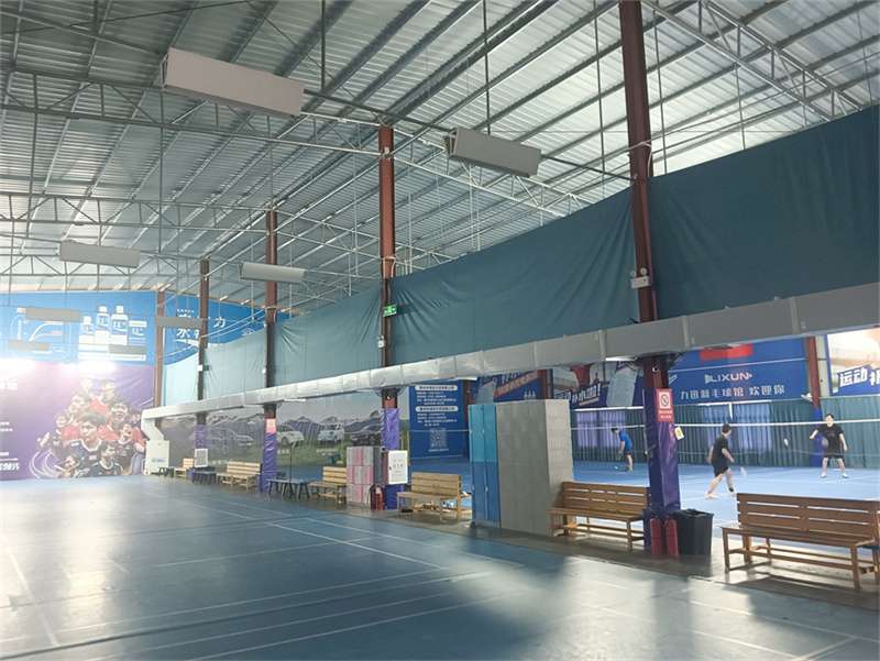 羽毛球馆作为高空间、大跨度的运动场所,普遍存在以下高温问题:一是场馆空间封闭,夏季太阳辐射透过屋顶和侧窗进入室内,热量易积聚且难以自然散发;二是运动过程中,球员身体产热量大,加上场馆内通风不畅,导致室内温度持续升高,通常夏季室内温度可达 32-38℃;三是传统风扇等降温设备仅能实现空气流动,无法有效降低环境温度,且易形成局部强风,影响羽毛球飞行轨迹,干扰运动体验。